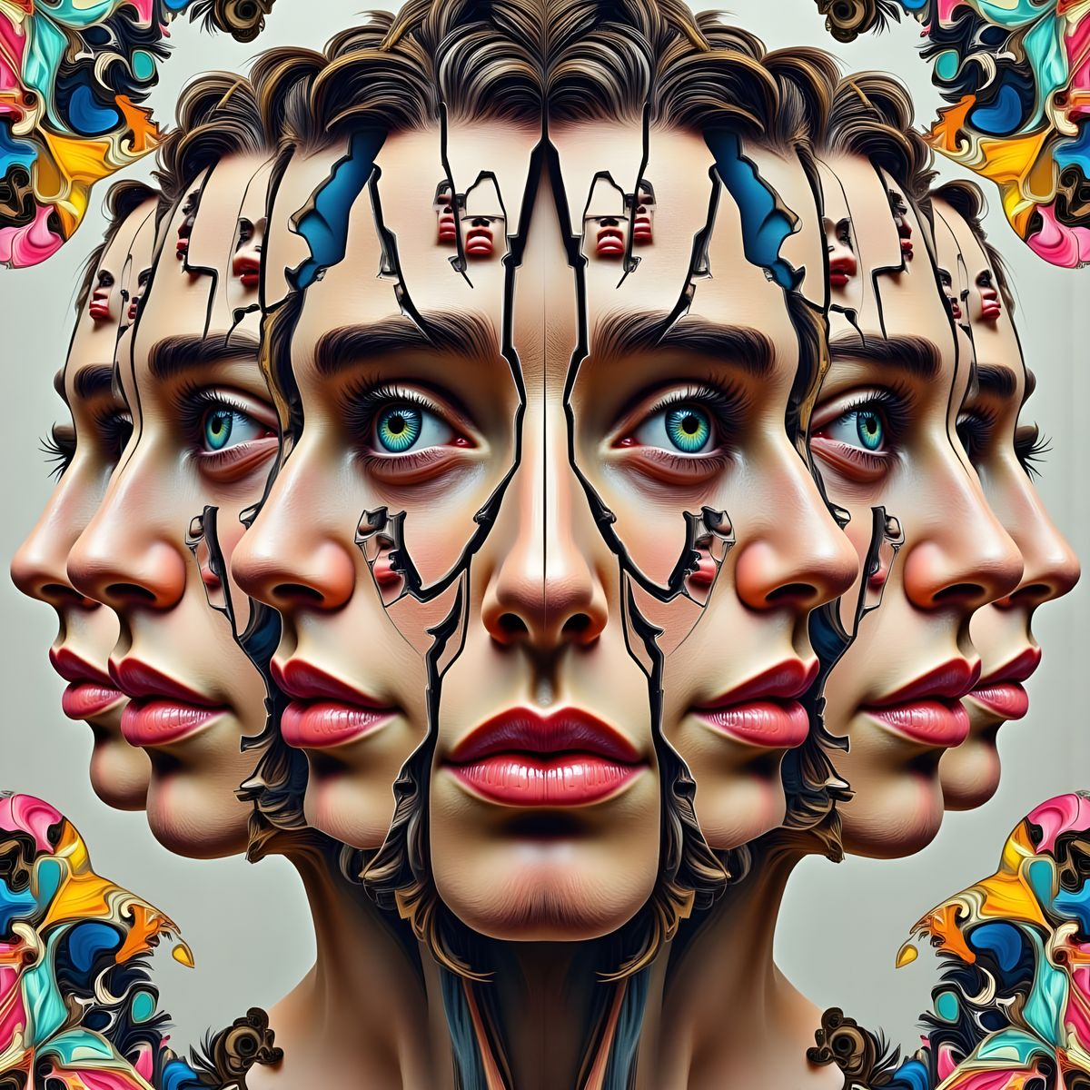 This image shows a face fractured into kaleidoscope-like fragments. The artwork evokes a street art aesthetic with mixed media elements, vibrant colors, and futuristic, fragmented forms.