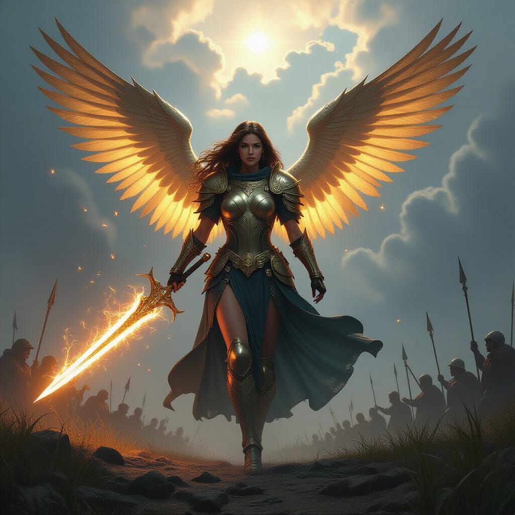 Imagina una imagen panorΓ‘mica de una guerrera celestial con alas doradas que desciende de un cielo tormentoso rodeada de luz divina lleva una armadura brillante y su espada flota envuelta en energΓa mΓstica. En su entorno un ejΓ©rcito la observa con asombro en medio de un campo de batalla Γ©pico.