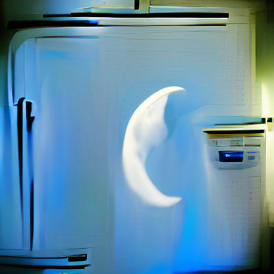 This image shows a brightly lit empty room, illuminated by the stark white light emanating from an open refrigerator, creating a minimalist and somewhat surreal scene.