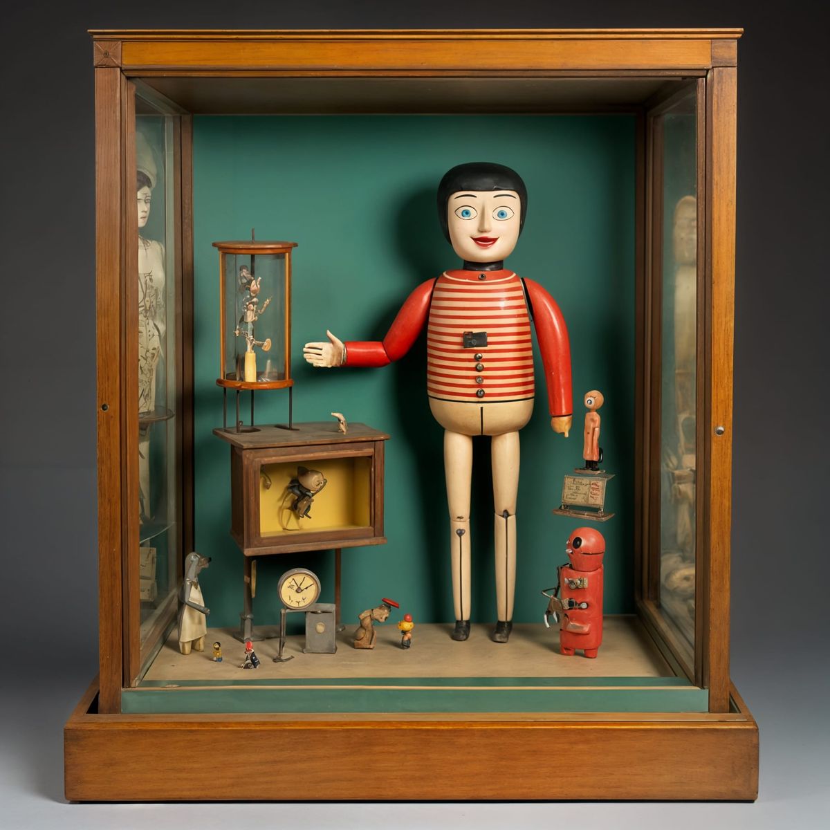 This image shows a whimsical clockwork acrobat toy inside a display case. The automaton is posed mid-performance, showcasing intricate details in a playful scene.