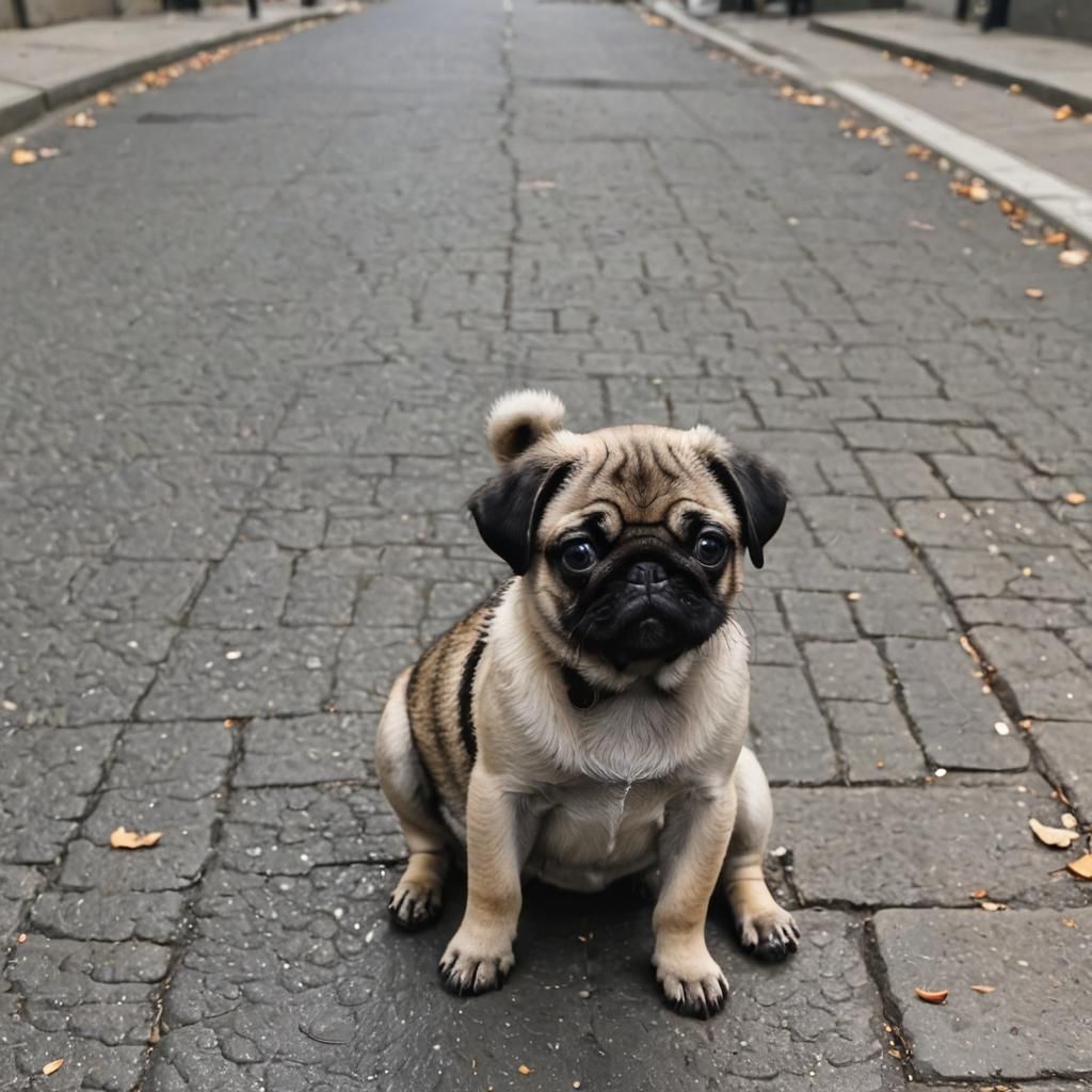 This image depicts a cute pug puppy sitting in a street setting. The puppy is begging, presumably for food, creating a heartwarming and slightly humorous scene.