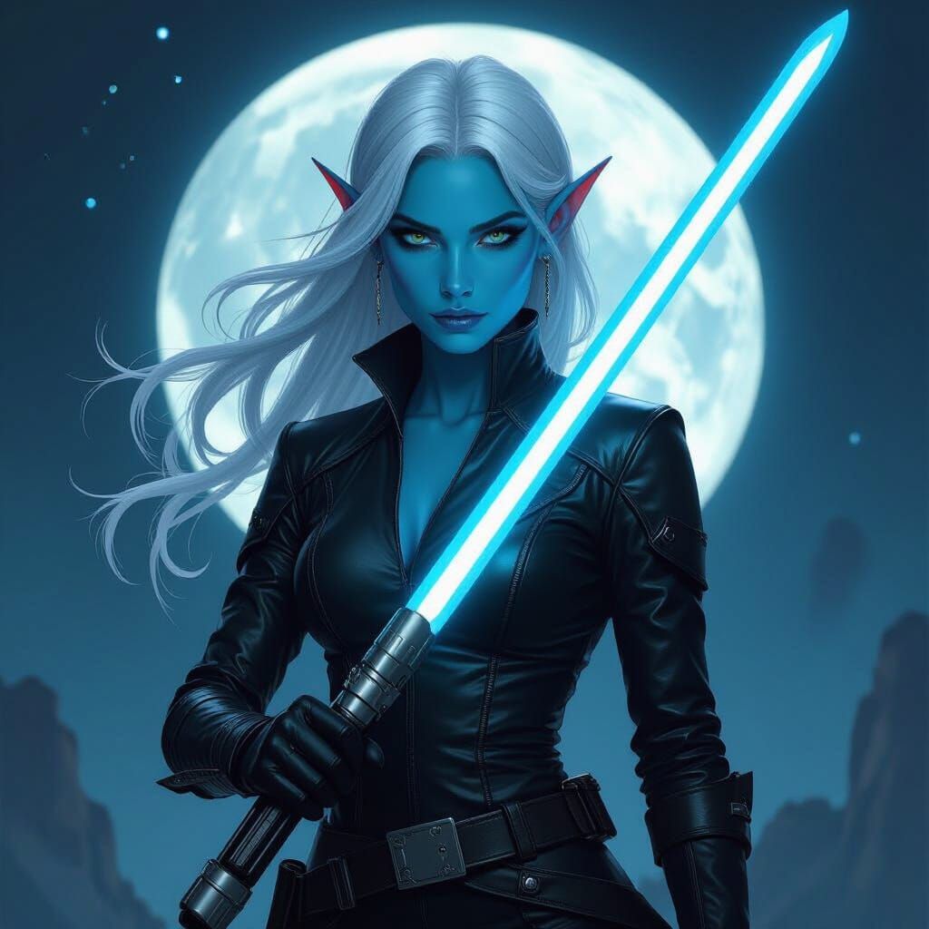 A digital painting of a blue-skinned moon elf with long silver hair and a black suit, holding a blue lightsaber. The artwork blends futuristic realism with vibrant colors and detailed textures.