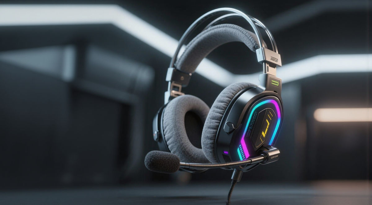 This image showcases an ultra-realistic, detailed render of a professional gaming headset. It features premium materials, RGB accents, memory foam cushions, and a microphone, in a futuristic yet practical design.