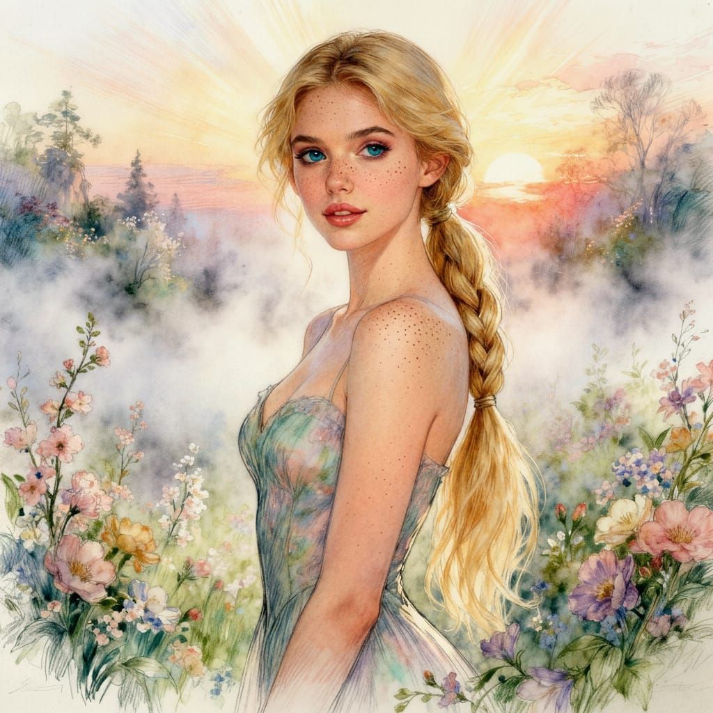 This watercolor and pencil sketch features a pretty woman with freckles and long blonde hair in a serene, misty sunrise. Her sparkling green-blue eyes and hourglass figure are rendered in a detailed, realistic style.