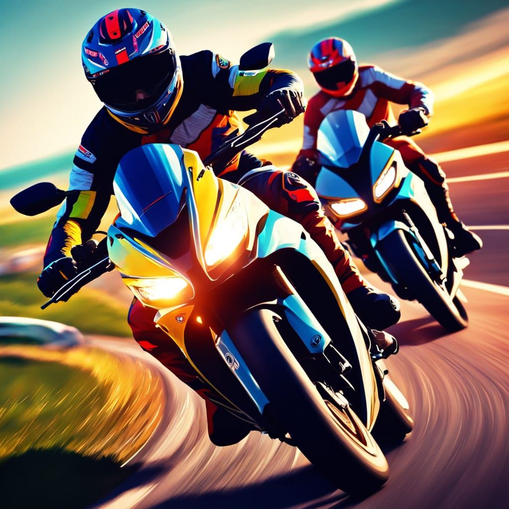 This dynamic digital artwork captures bikers racing on a winding road with sweeping lines of speed. The scene features sunlit countryside and warm golden lighting in a colorful, action-packed style.
