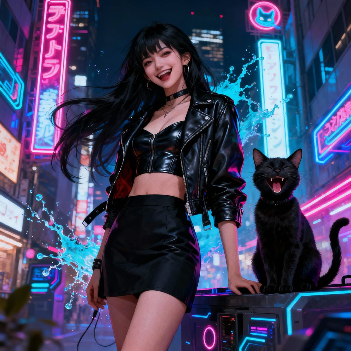 A woman with long black hair and a black outfit stands in Tokyo at night, surrounded by neon lights. A black cat is present in this detailed, fantastical matte painting.