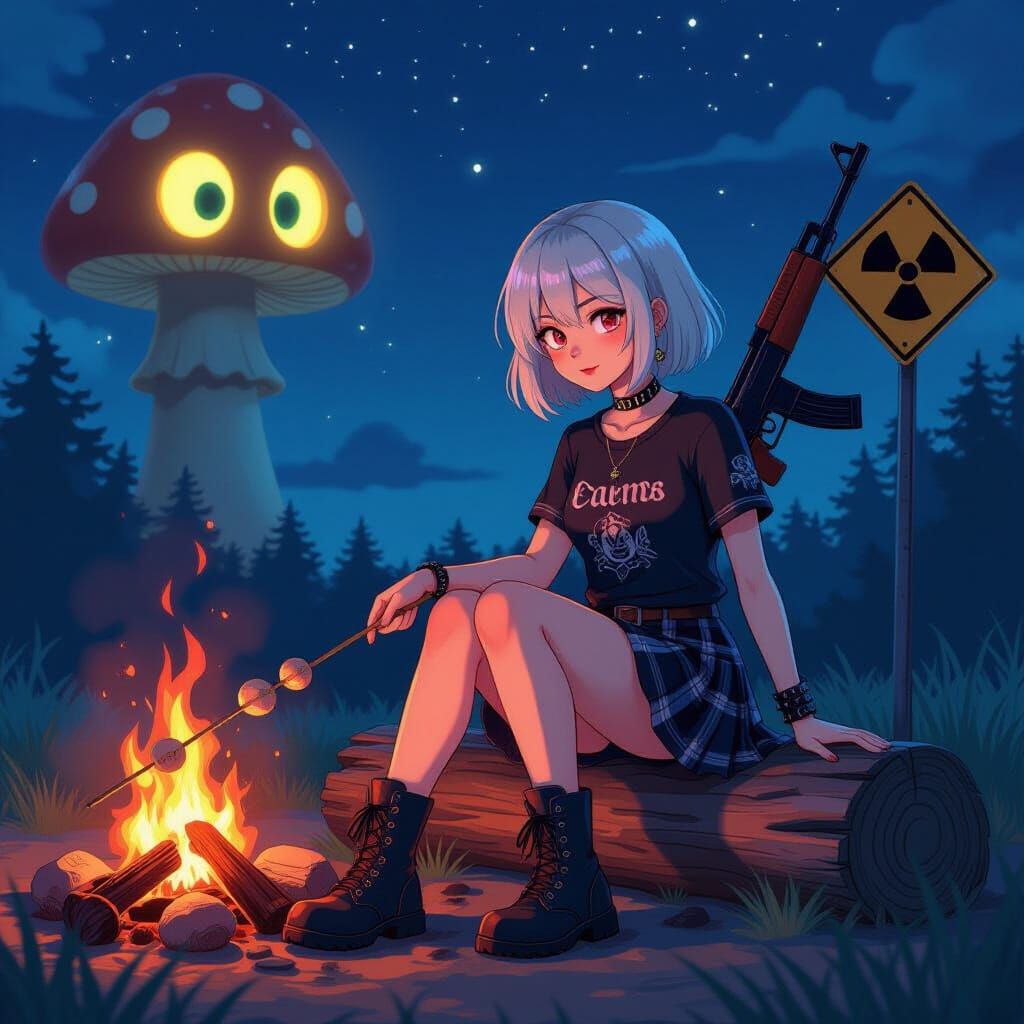 This image shows a young Emo woman in a school skirt sitting by a fire, roasting mushrooms. An AK 47 rests on her shoulder, under a night sky, in a vibrant anime style.