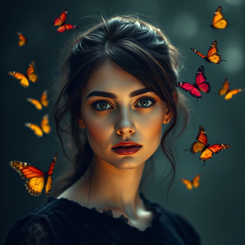 This image shows a mysterious young woman in dark, rich tones, surrounded by butterflies, evoking the essence of Renaissance art with subtle spiritual undertones.