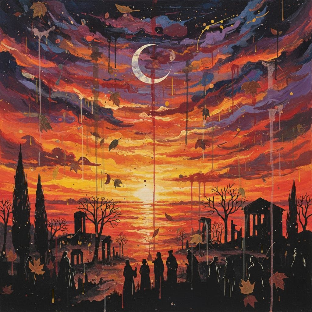 This image captures a cosmic, autumnal scene featuring a colorful sunset and a crescent moon. The style evokes surrealism and expressive brushwork.
