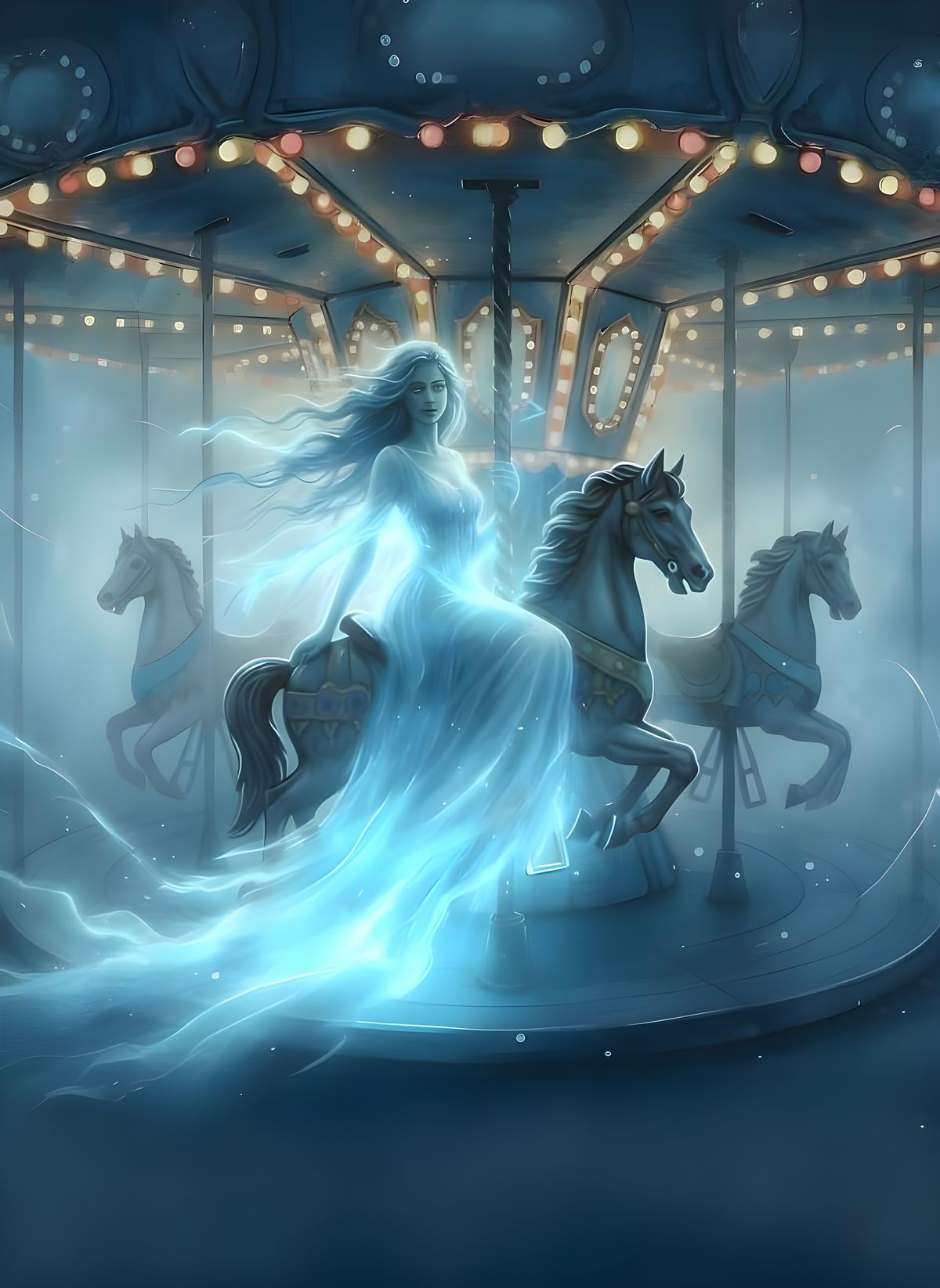 A haunting image of a spectral woman gracefully riding a classic carousel, evoking a sense of mystery and nostalgia.