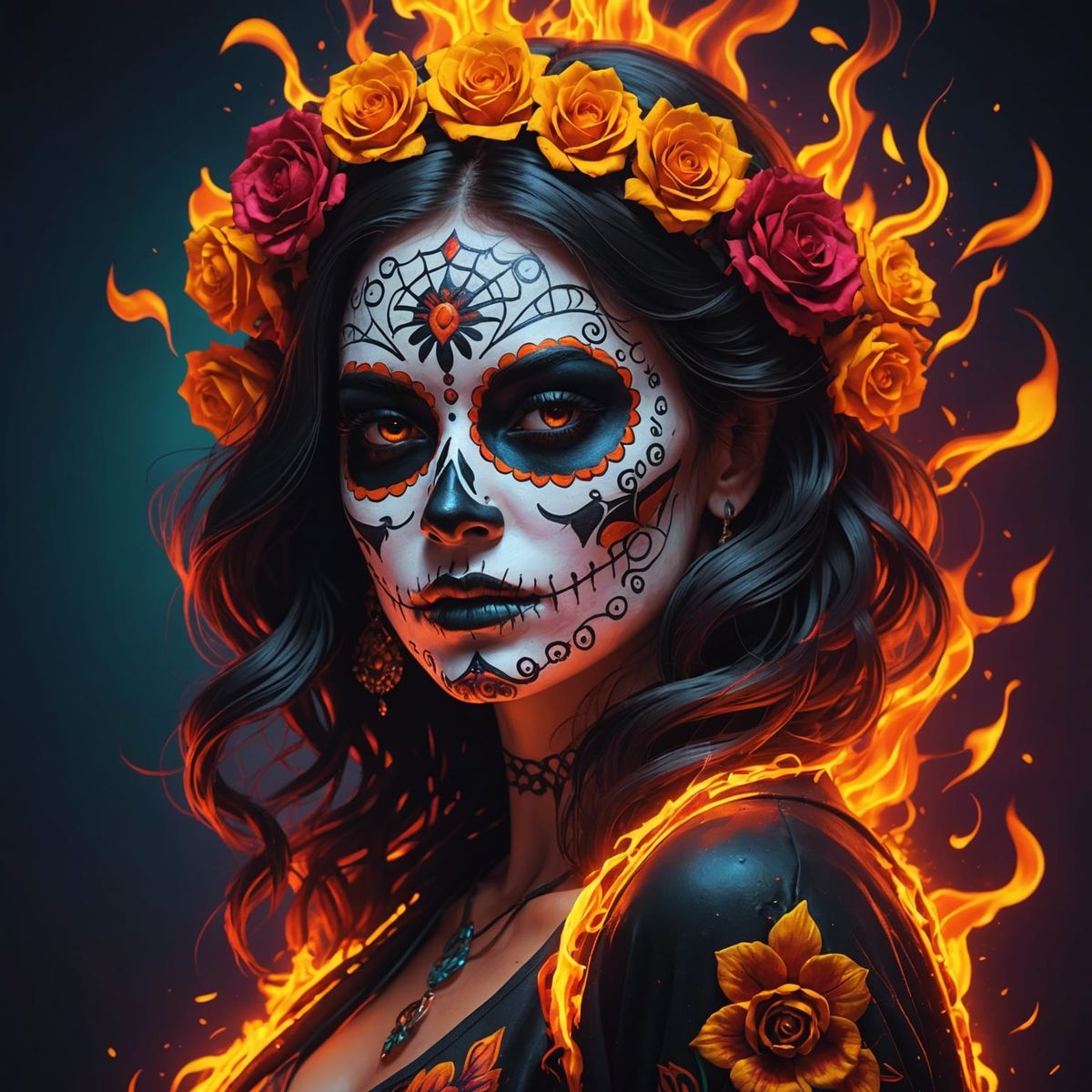 A vibrant image of a girl in Day of the Dead style. The portrait features hyperrealistic details and a colorful, dramatic aesthetic with a neon inferno theme.