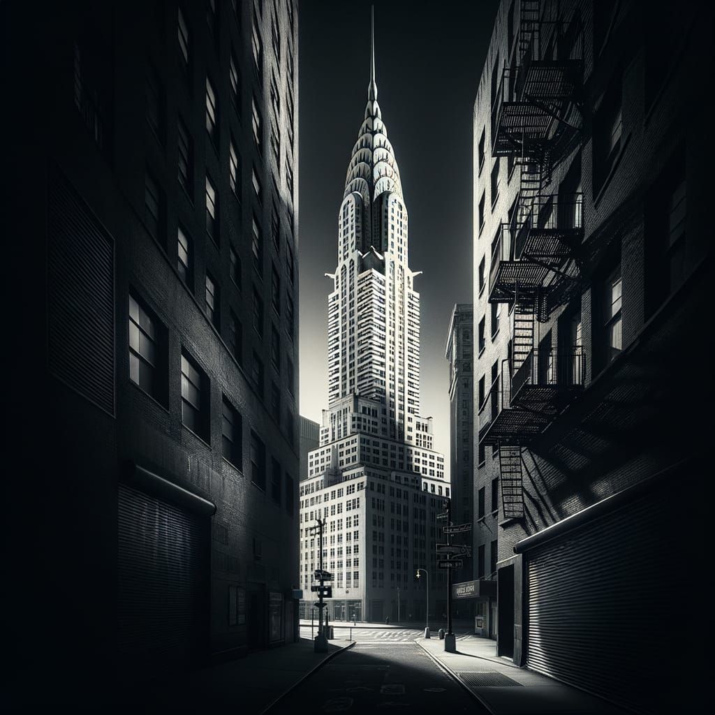 A dramatic black and white photograph of the Chrysler Building in New York City, seen through a narrow urban alleyway, with deep shadows and stark contrast highlighting its Art Deco features.