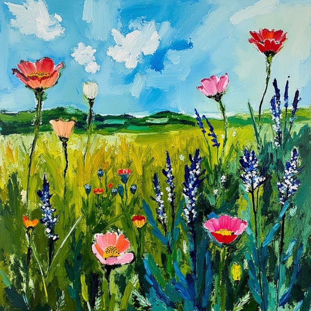This dynamic, textured painting captures a lush meadow scene with wildflowers and blue sky, featuring bold brushstrokes and vivid colors reminiscent of abstract expressionism