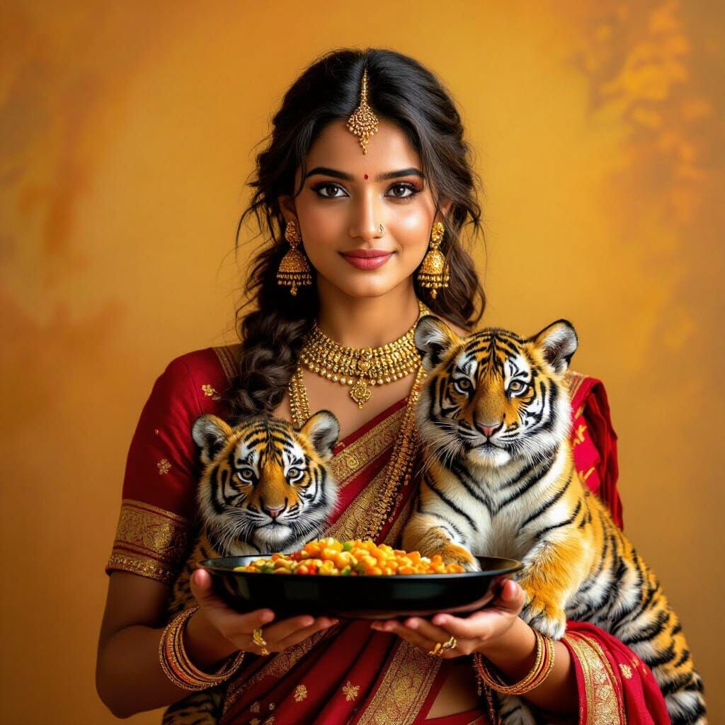 This image shows a young Indian woman in traditional clothing holding a black plate, upon which stand a tiger and cub. The style blends cinematic Bollywood with realistic photography.