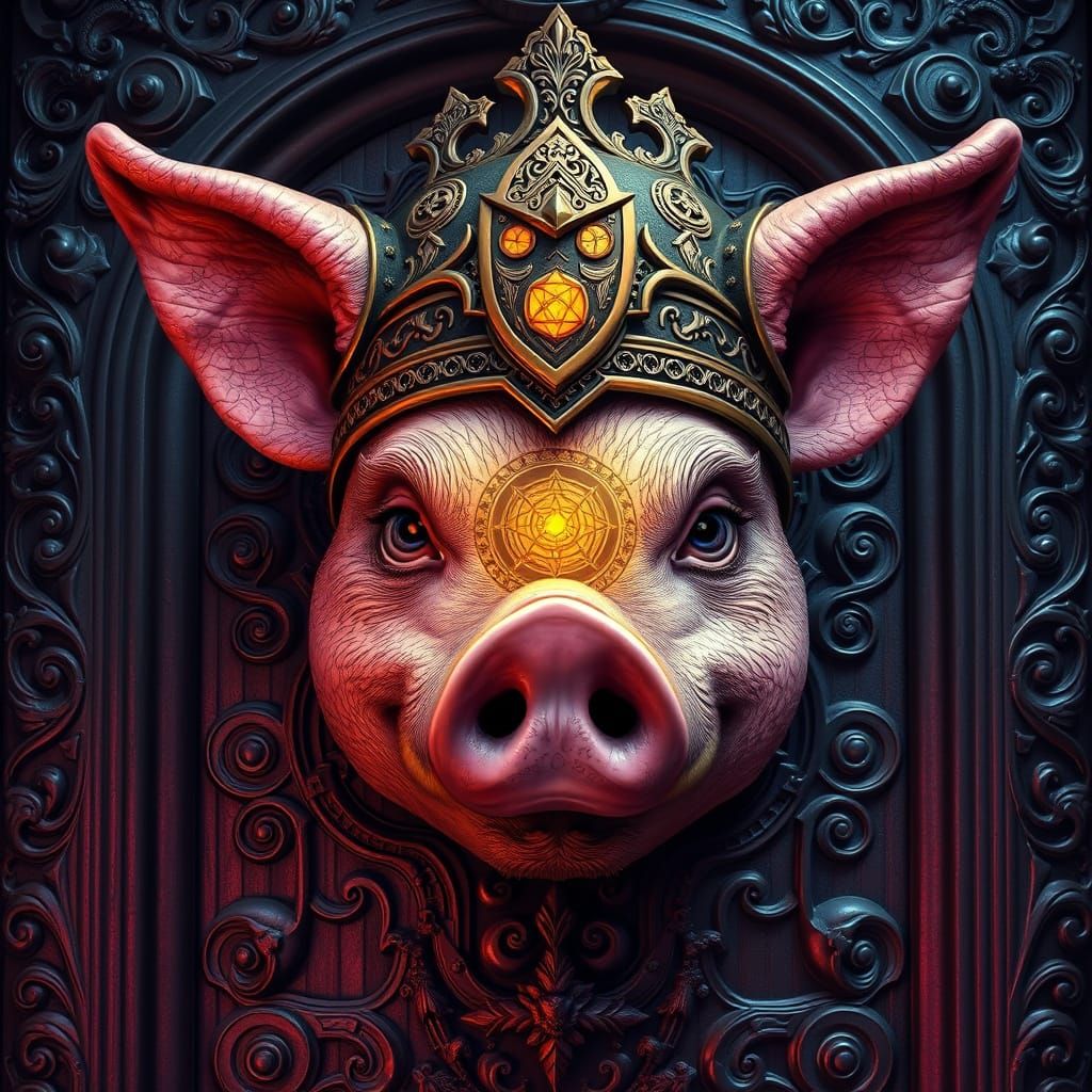 A striking picture of a pig-man's head wearing a mystical helmet. An ancient door sits in the center of its forehead, decorated with mysterious symbols in a dark fantasy aesthetic.