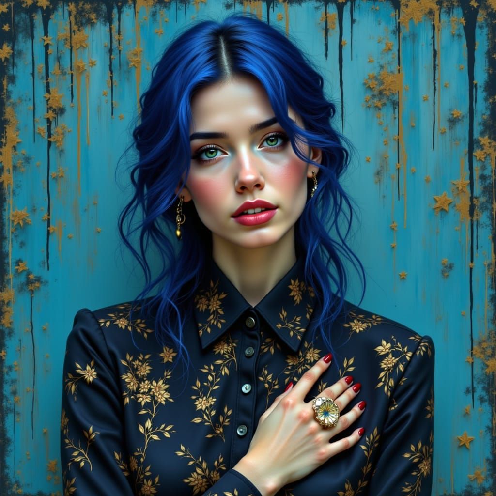 This image shows an elegant Muslim woman wearing a dark blue veil. The artwork blends realistic details with impressionistic touches, in a style reminiscent of street art.