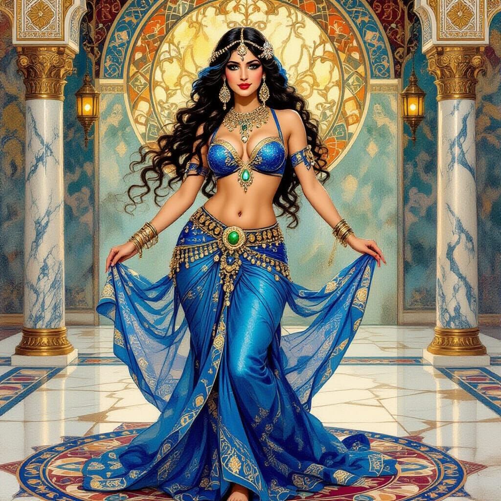 A vibrant image of an oriental belly dancer in traditional blue and gold attire, set against an Ottoman backdrop with marble floors and oil lamps. The artwork is in a vibrant gouache style.