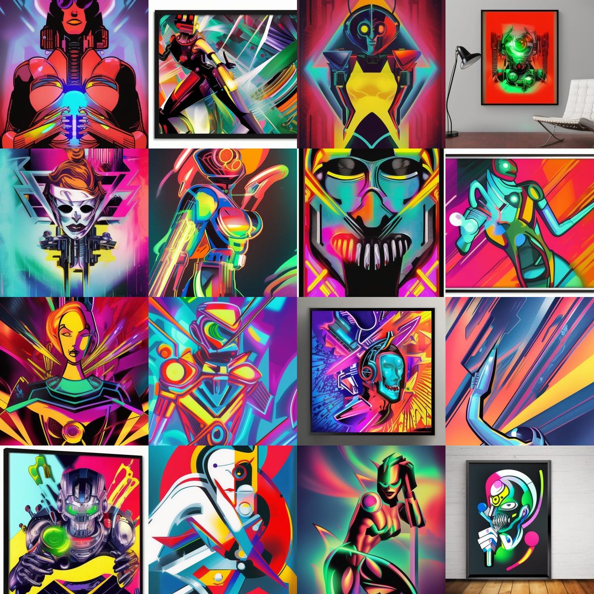 This image shows a cyborg bartender rendered in triadic colors with volumetric lighting. The artwork has art deco and maximalist elements, reminiscent of splash art posters.
