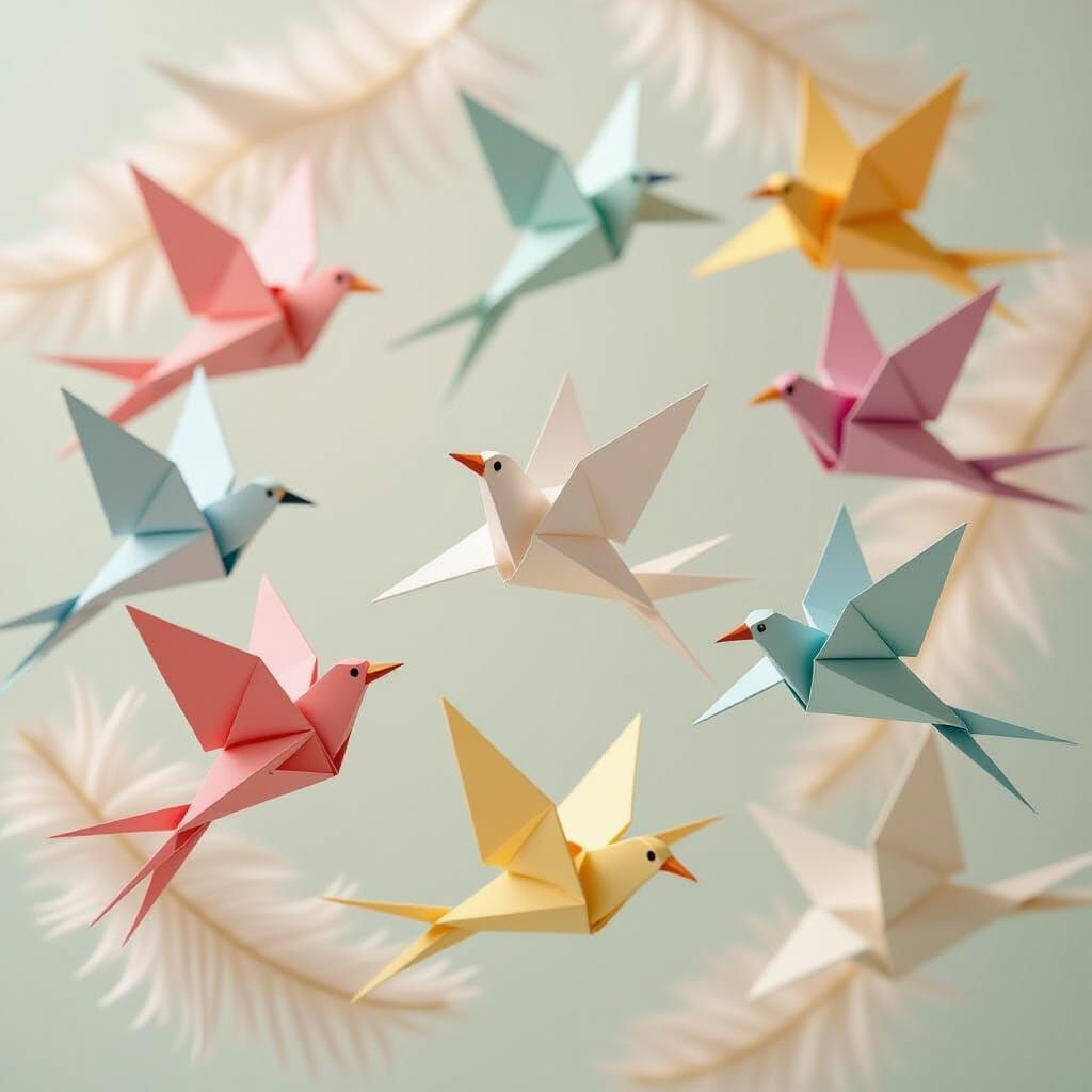 A vibrant image of origami birds in flight. The artwork features soft textures and intricate paper folds in a whimsical style reminiscent of pop surrealism.