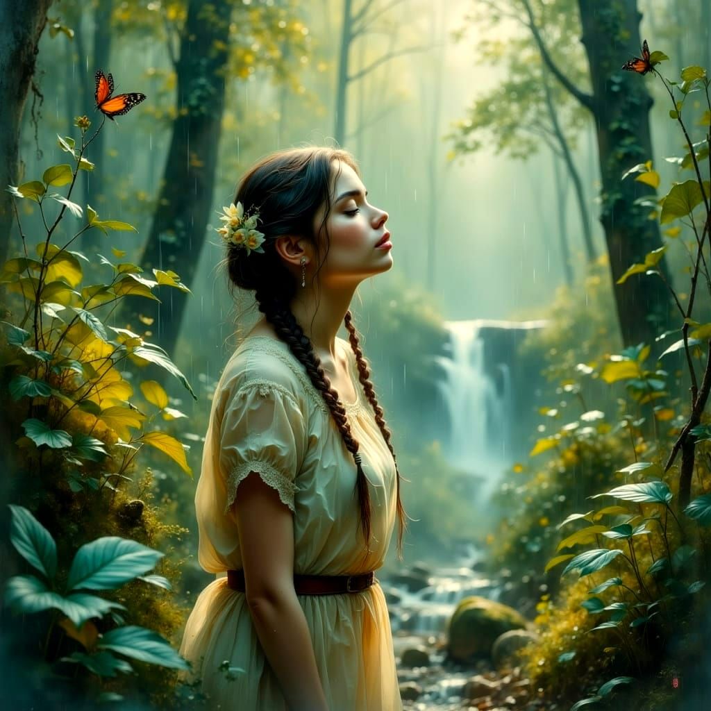 This image shows a braided woman in a vibrant green forest, seemingly unfazed by the falling rain. The scene has a soft, dreamlike quality with a cozy and ethereal aesthetic.