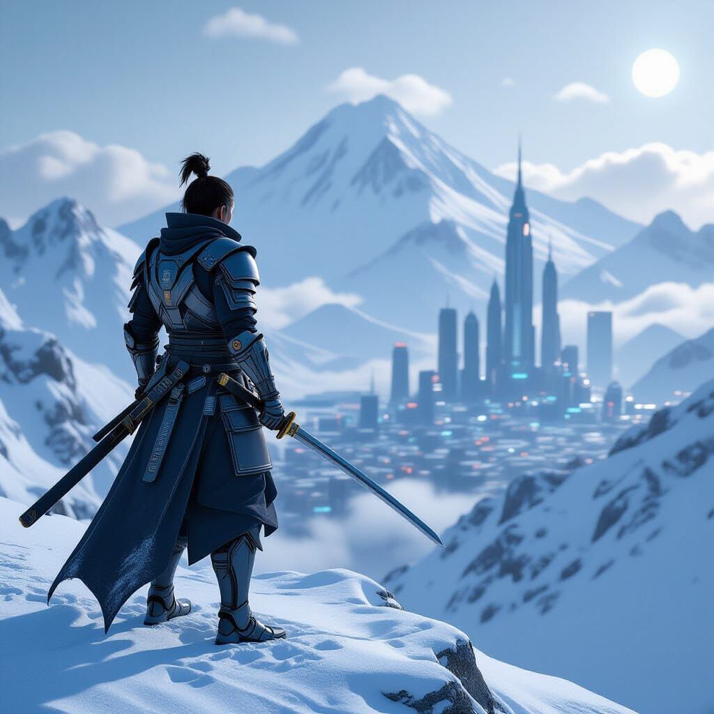 This image shows a cybernetic samurai on a snowy mountain, overlooking a futuristic city. The scene is rendered as a matte painting with deep colors and fantastical elements, in a concept art style.