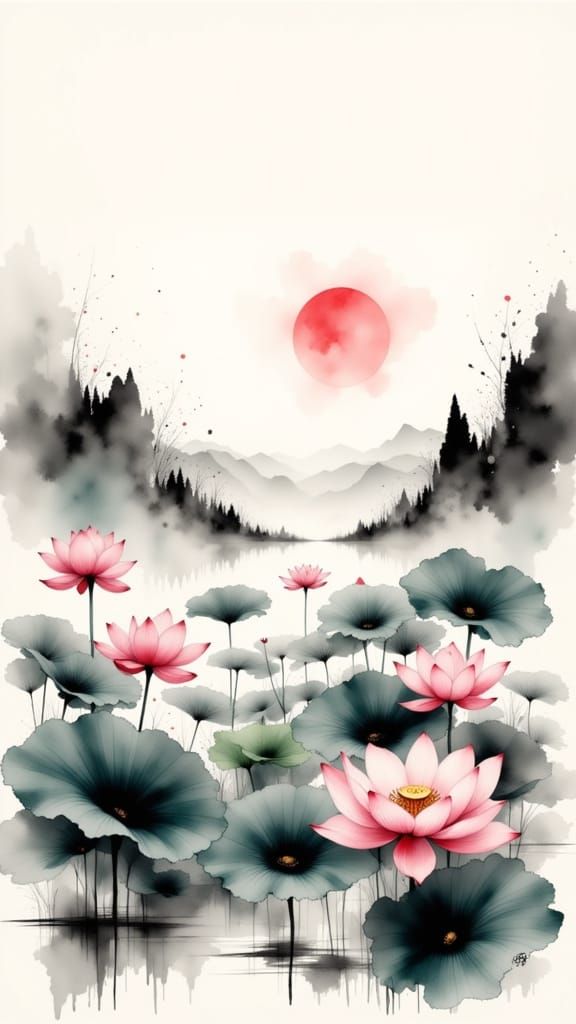 Easily generate beautiful ink wash watercolor lotus landscapes for free with our AI image generator. Try it now!
