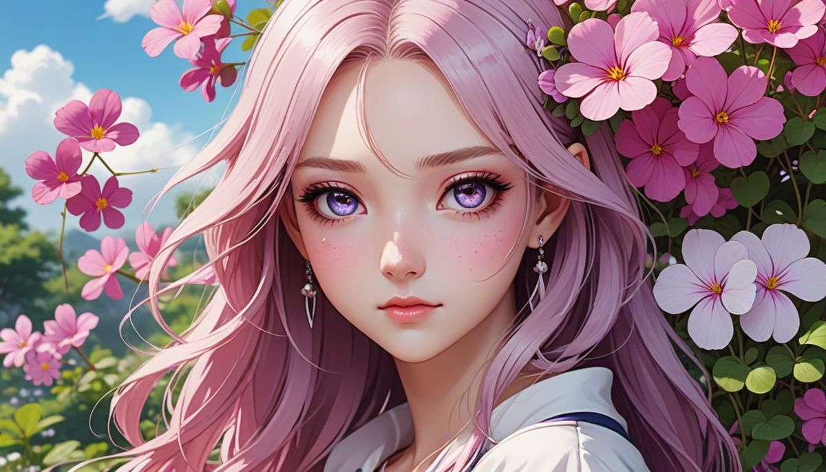 This image shows a vibrant, colorful scene of a pink Oxalis purpurogenum flower in a whimsical anime setting, blending fantasy and realism.