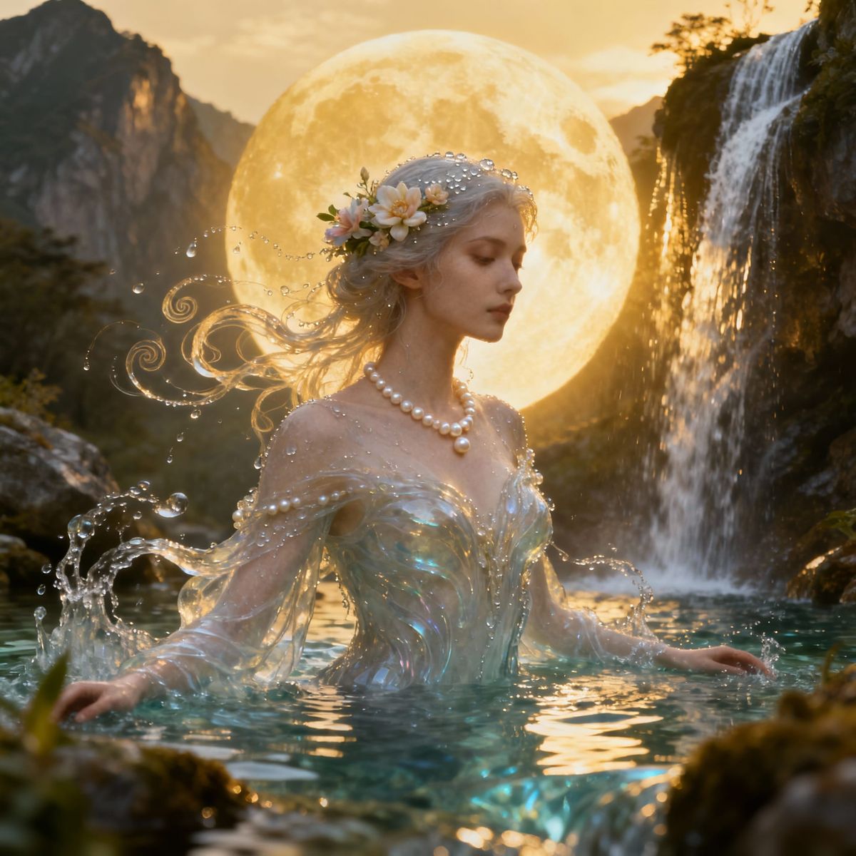 This photorealistic image shows an ethereal water goddess shimmering like moonlight, emerging from a clear mountain spring. Cascading waterfalls and delicate flowers adorn her.