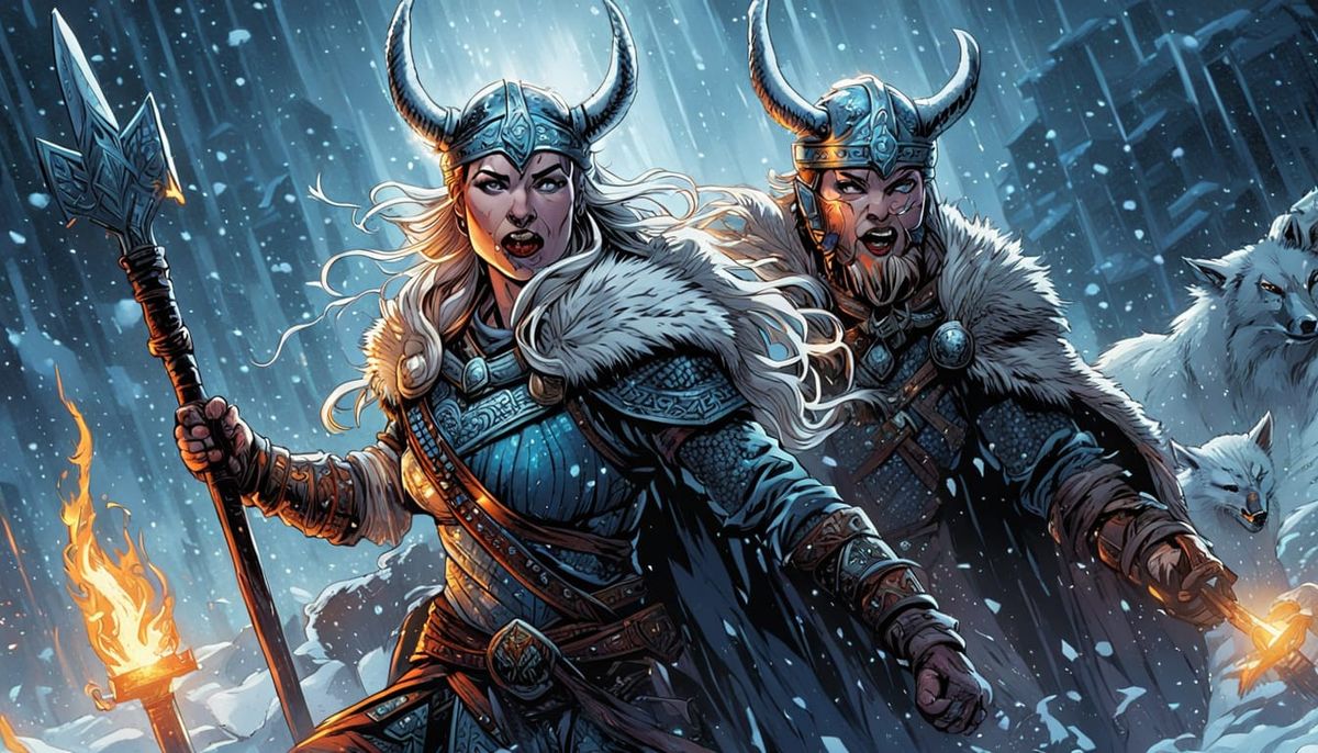 A comic book illustration of a Viking queen with a white wolf, rallying her warriors in a snowy forest clearing. The image features vibrant colors and bold lines with dramatic lighting.