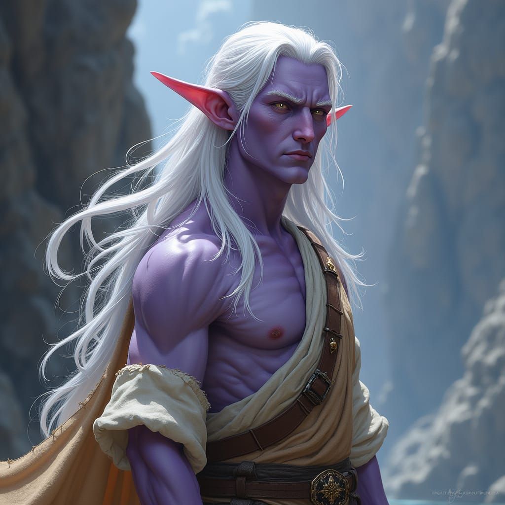 A striking image of a 30-year-old light purple elf with long silver hair, war marks, and a worn linen shirt, blending mystical and ancient fantasy elements in a whimsical and elegant style.
