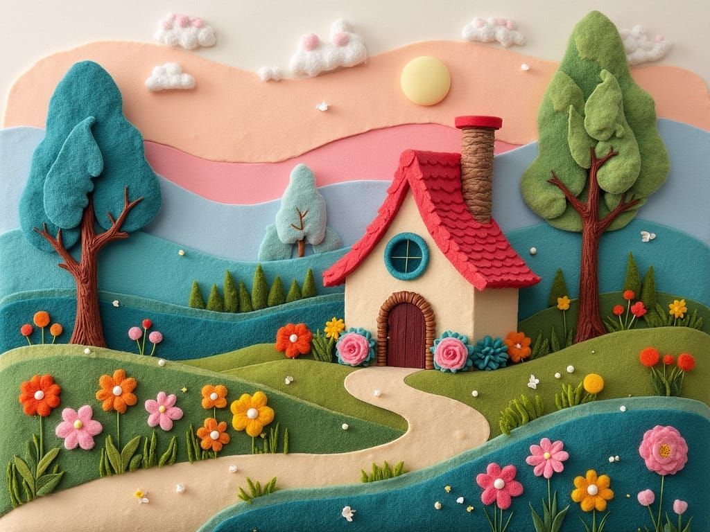This image shows a whimsical cottage constructed from layered felt, nestled among felted trees and flowers. A soft, pastel-colored felt sky completes this idyllic, handcrafted scene.