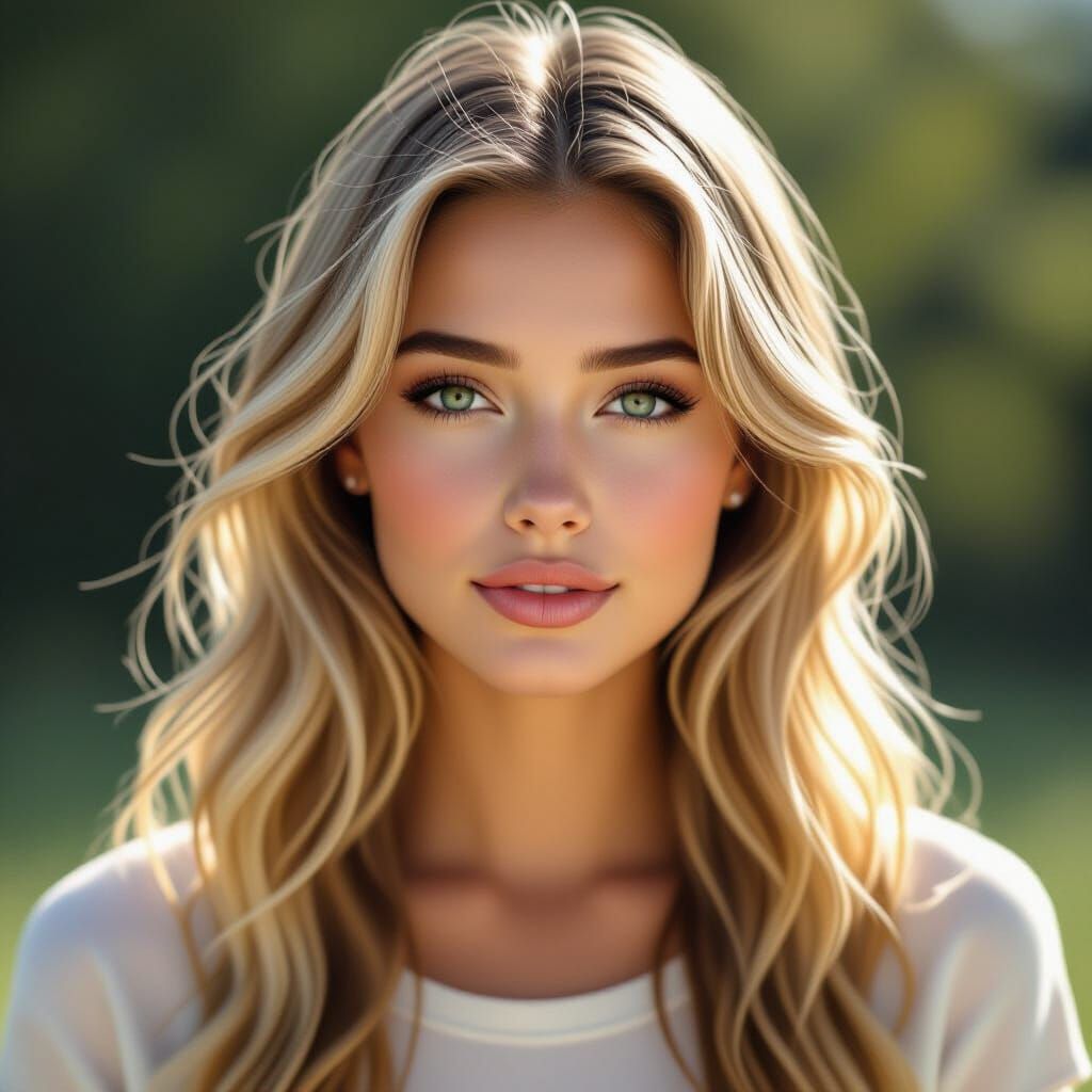 This image showcases a hyperrealistic portrait of a woman with long blonde hair, featuring natural elements and a touch of anime style, set in a rural European landscape.