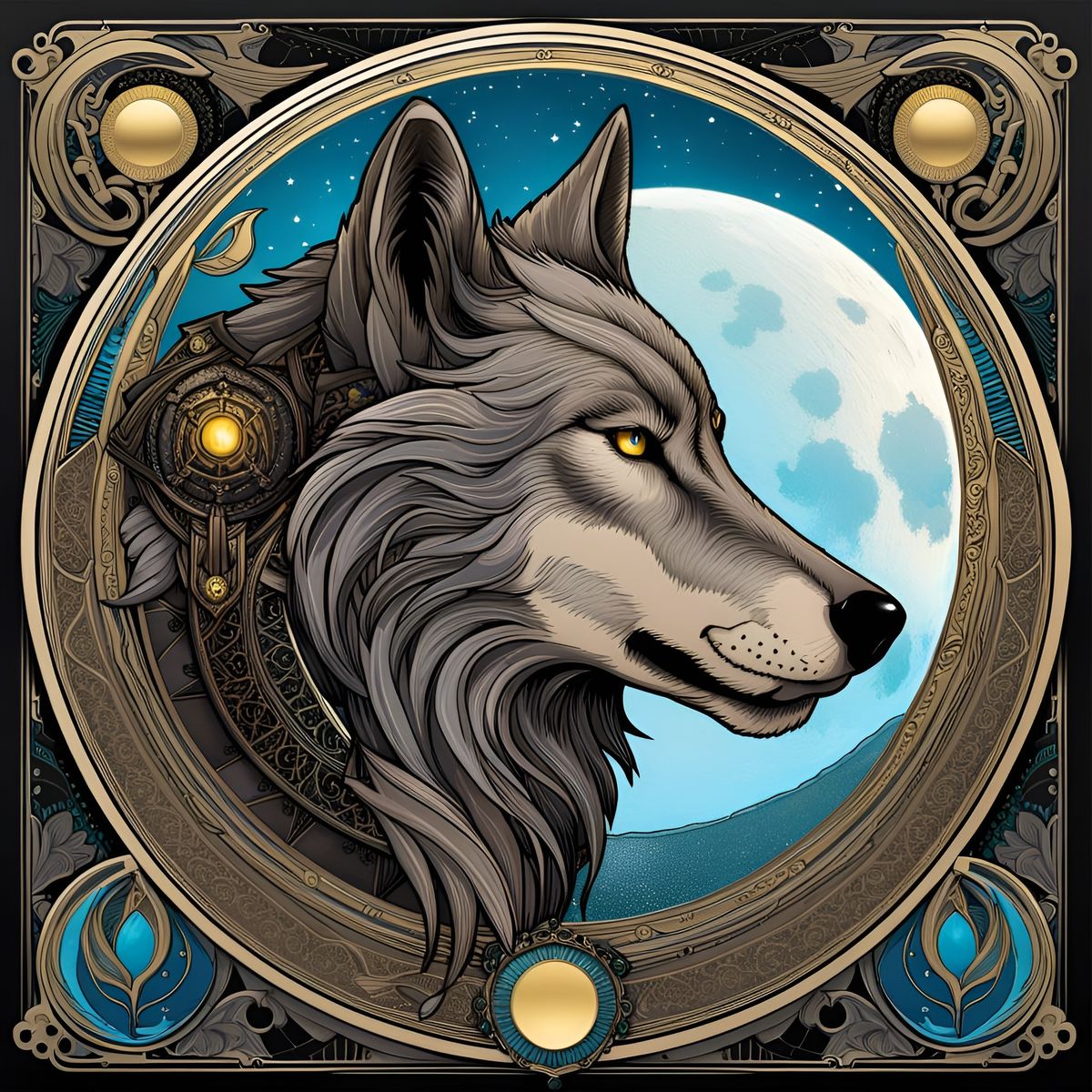 A striking picture of a wolf-themed cyberpunk tarot card. The card features a detailed frame and a side profile of a cyberpunk head set against a large moon, styled in Art Nouveau.