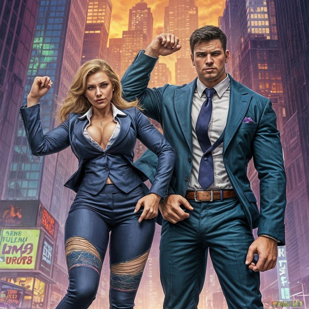 This dynamic image shows a muscular woman and man 'hulking out' in a vibrant city background, with bold lines, exaggerated poses, and a mix of digital painting and dynamic lighting, reminiscent of comic book art.