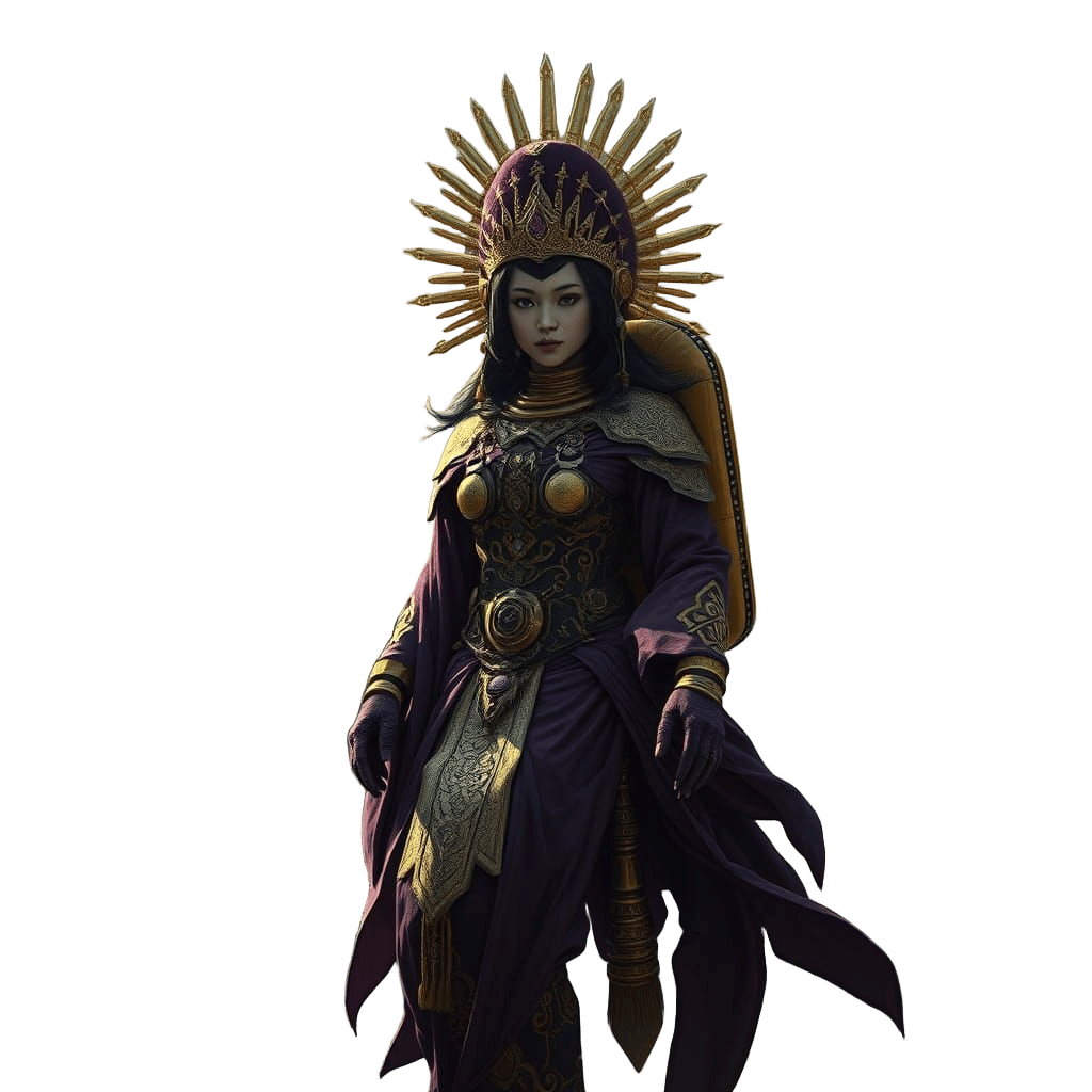 This image shows a stunning, high-resolution depiction of a Tibetan woman shaman astronaut in a futuristic, ornate spacesuit, descending onto a mystical alien landscape with an ancient structure in the background, blending dark fantasy and art nouveau styles with vibrant purple and yellow hues.