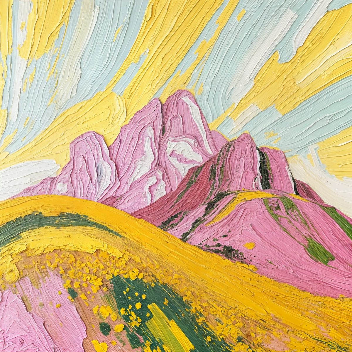This image showcases a textured landscape painted in bold yellow and pink tones, creating a vibrant and eye-catching visual effect.