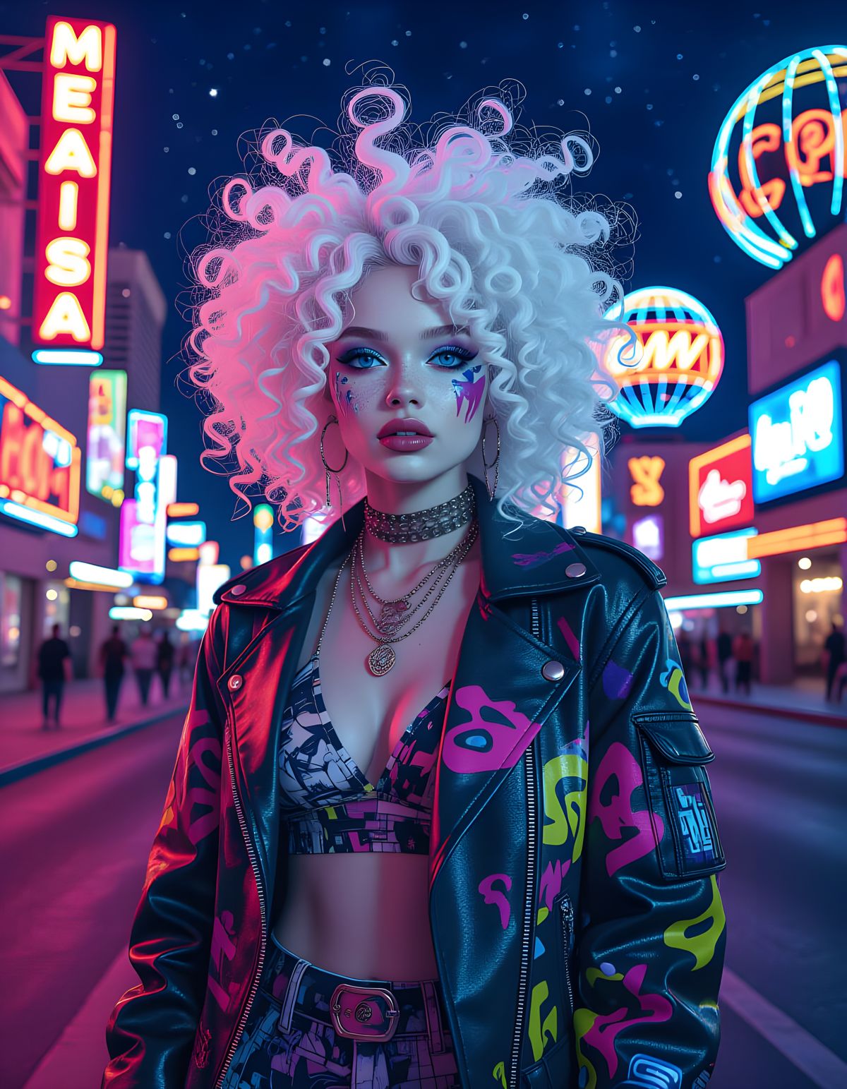 This image depicts a woman with curly white hair and blue eyes amidst the vibrant Las Vegas strip, rendered as spray paint space art. A striking visual of contrasting elements.