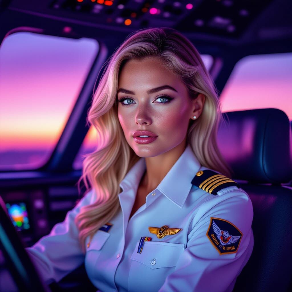 This image shows a blonde pilot in uniform looking over her shoulder. A sensual and mysterious mood is created with vibrant neon colors in a retro synthwave style.
