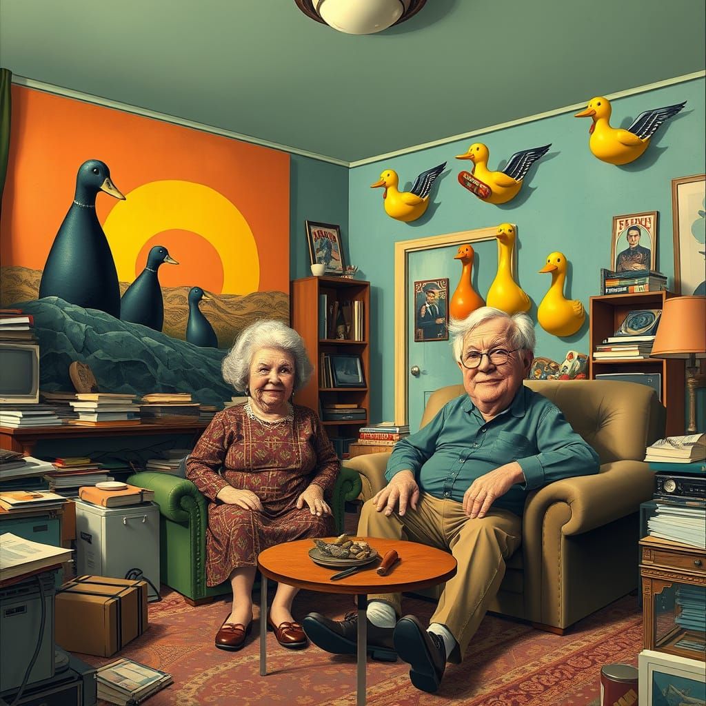 This image shows a nostalgic living room scene featuring a quirky, aged couple surrounded by a cluttered, retro-style space, a vibrant mural, and iconic flying ducks, evoking a sense of surreal monotony and everyday surrealism.