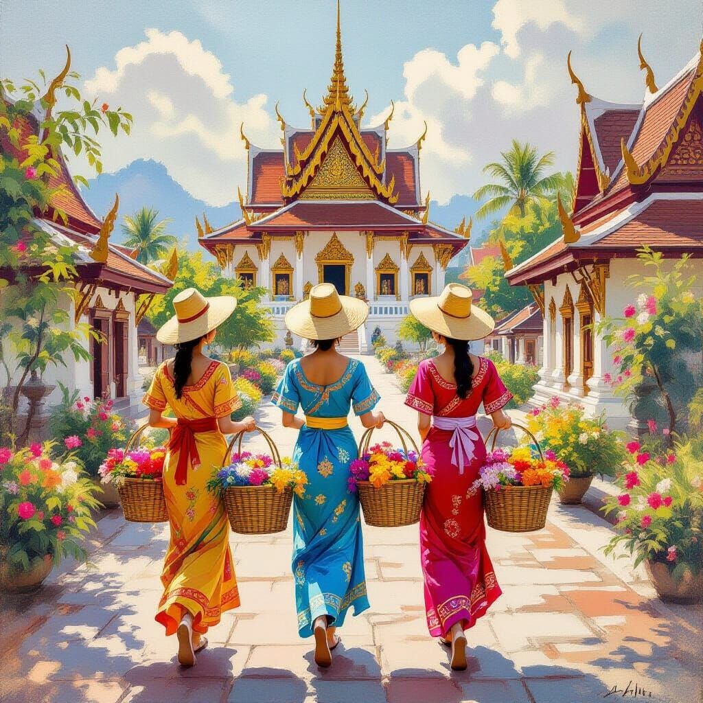 This image shows three elegant Laos women in vibrant traditional attire carrying flower baskets towards a pagoda. Detailed oil painting with warm afternoon light, inspired by Sargent and Bierstadt.