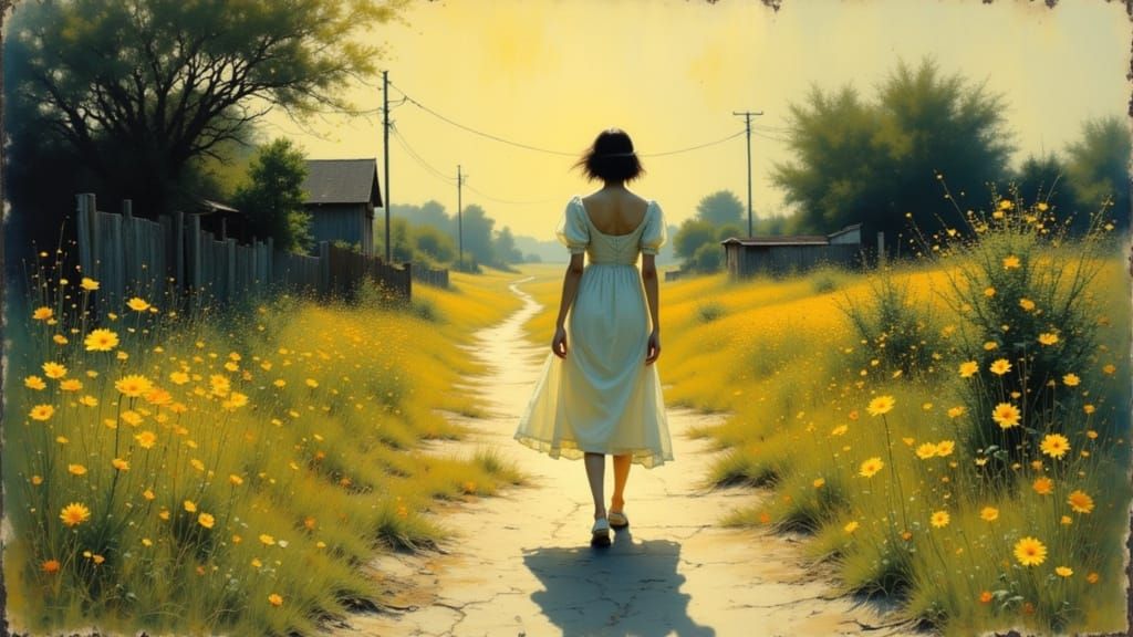 This oil painting depicts a solitary figure in a summer dress walking down a sunlit path, conveying nostalgia and melancholy. Features visible brushstrokes and impasto textures with golden hour lighting.