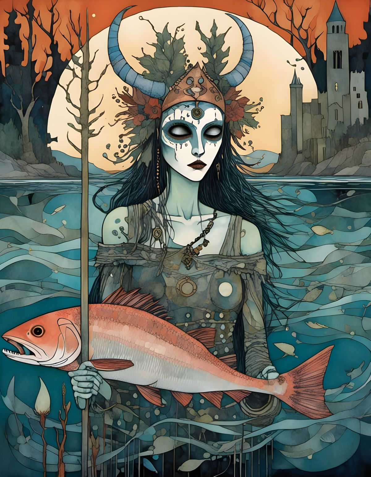 <lora:The Magic Loch:1.0> Surreal Gothic illustration. Medium shot. Quirky Viking warrior girl in half skull mask spears a fish from a salmon-filled full moon. High contrast. Dark fantasy. Simple colors. Tim Burton style. Gothic architecture in the background. Shimmering blue and green hues in the moonlit ...
