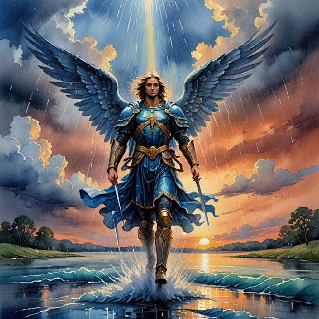 This image shows Archangel Michael descending from the heavens during a rain shower. The scene features blue skies, a sunset, and glowing water rendered in watercolor and pastel art style.