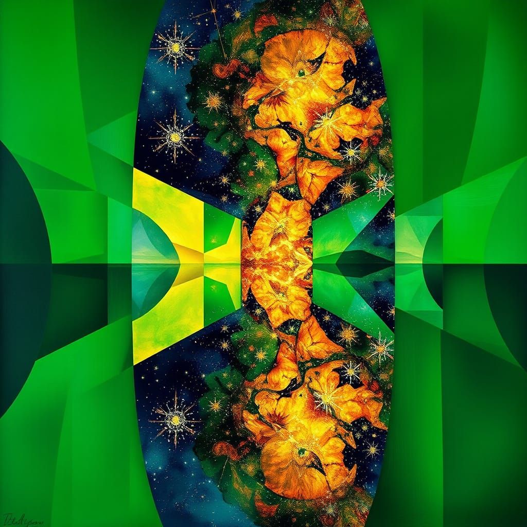 This image features a vibrant green liquid acting as a celestial mirror, reflecting stars and the firmament. Rendered in abstract cubism with geometric planes and fragmented forms.