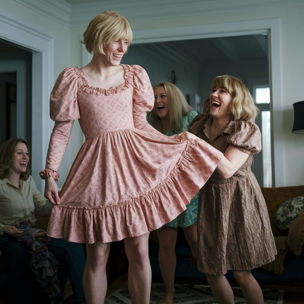 A cinematic film still captures a young, embarrassed man in a frilly minidress, with a woman lifting the hem. Other women are present, with a petticoat visible.