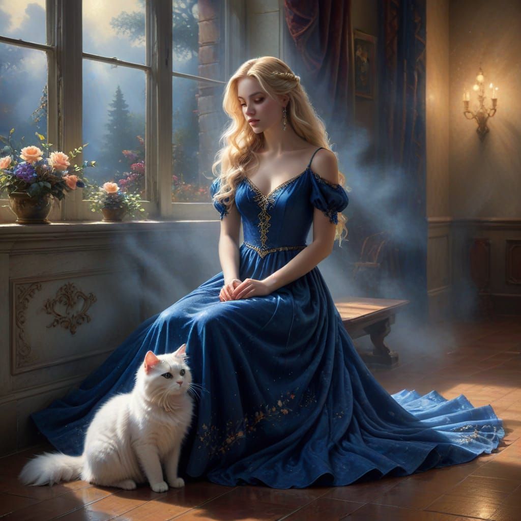 This image shows a beautiful woman with blonde hair in a blue dress, seated by a window in an empty ballroom. Cinematic lighting highlights her contemplative mood.