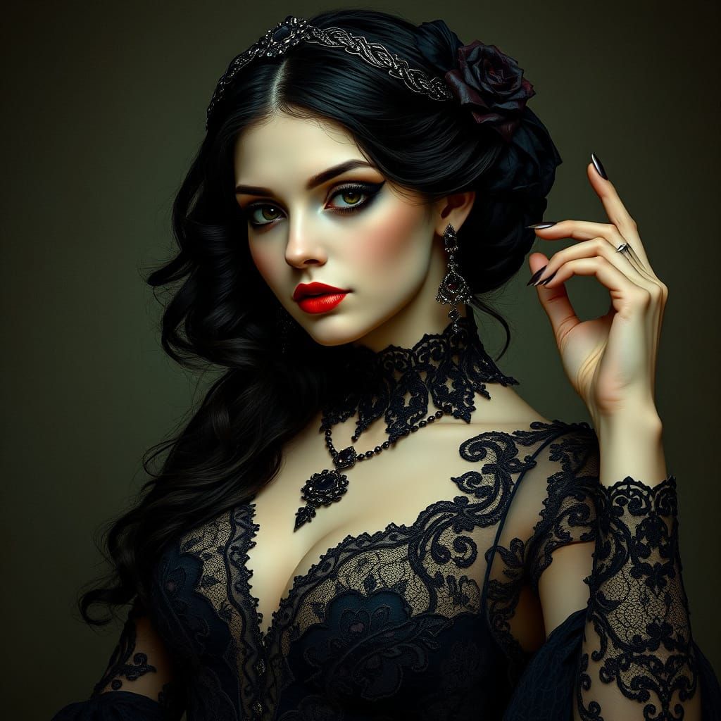 This image captures a mysterious gothic woman in intricate lace attire, adorned with dark jewels, her pose evoking a sense of romance and mystique, blending the elegance of Art Nouveau with the soft focus of sfumato.