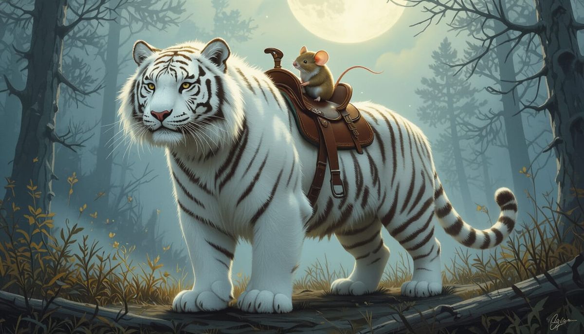 A majestic white tiger with a fluffy coat and saddle carries a small mouse through a misty, moonlit forest. Features fantasy realism and vibrant details with soft lighting.