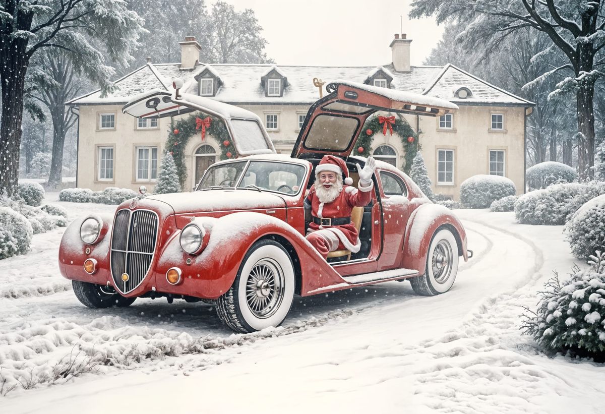 This image shows Santa Claus piloting a classic 1940s gullwing coupe, with a gentle dusting of snow falling around the vehicle.
