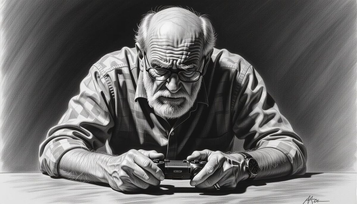 This hyperdetailed charcoal drawing shows an elderly gamer experiencing joint pain and lamenting their advancing age. The art style captures the subject's weariness.